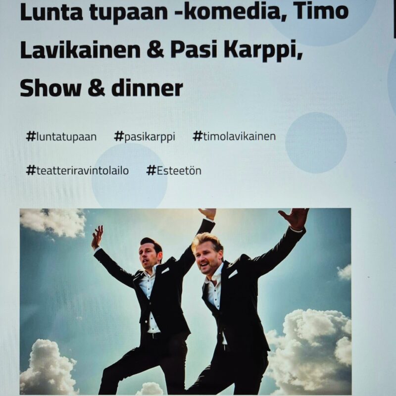 Ammattiosasto 423 tarjoaa Lunta tupaan illan Teatteri ravintola Ilossa perjantaina 21.11.2025 klo:17.30. Hallituskatu 7 Mikkeli. Sisäänkäynti kävelykadulta. Ammattiosasto tarjoaa ruoan, pääsylipun ja alkumaljan. Ilmoittaudu mukaan iloiseen iltaan viimeistään 12.11 ja ilmoita myös allaolevasta ruokalistasta minkä pääruoan otat. Ilmoita myös mahdollinen allergia.