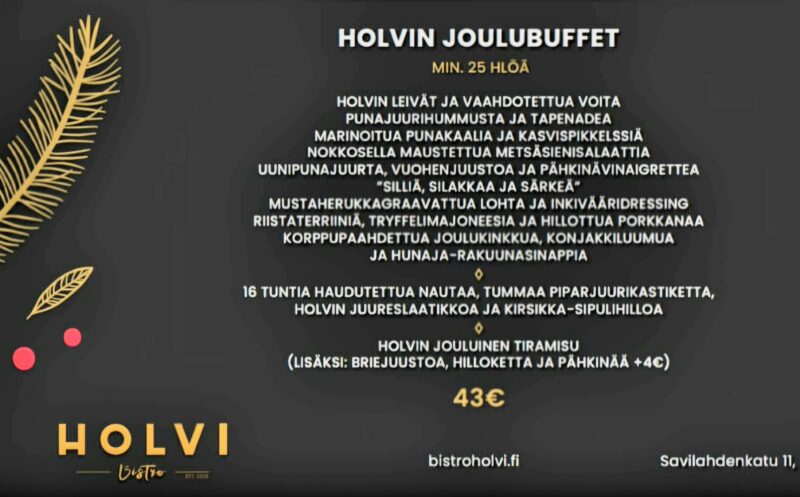 Ammattiosasto tarjoaa jäsenille Bistro Holvin joulubuffetin. Imoittaudu viimeistään 19.11 mennessä: super423@superliitto.fi tai tekstiviestillä/wa viestillä nro:050 3626575. Ilmoita myös mahdollinen erityisruokavalio.